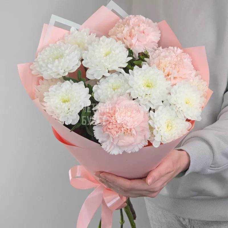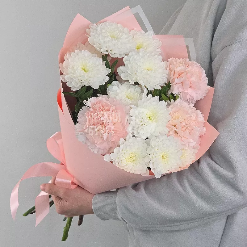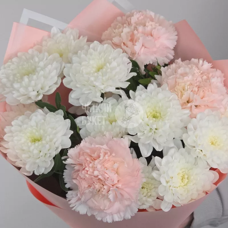 Букет из белых махровых хризантем и розовых гвоздик