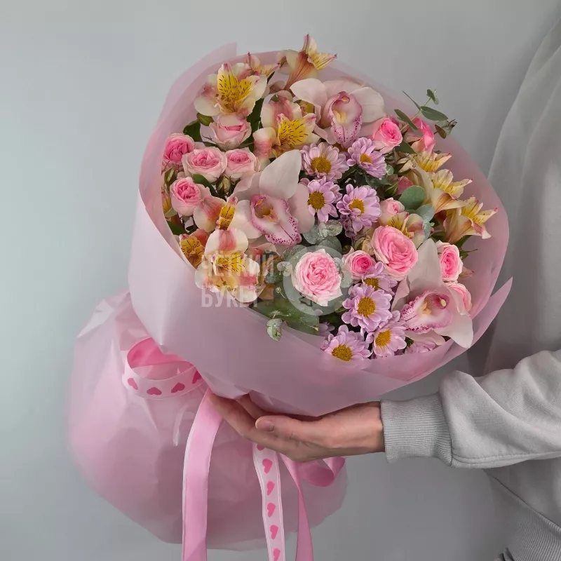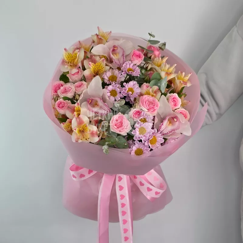 Букет из сантини альстромерий розовых кустовых роз и орхидей
