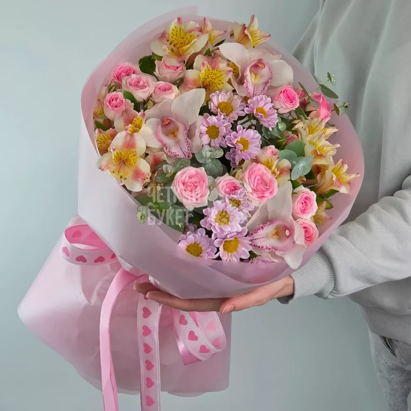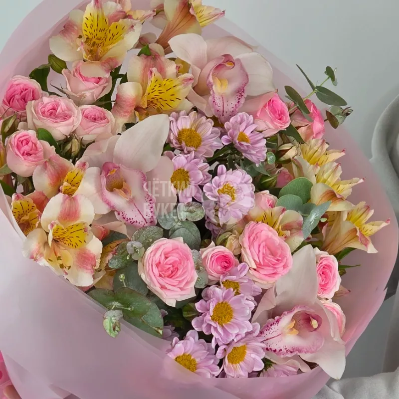 Этот элегантный букет сочетает в себе нежность сантини и изящность альстромерий, создавая лёгкое и воздушное настроение. В него добавлены роскошные кустовые розы розового оттенка, подчеркивающие романтичность композиции. Орхидеи придают цветочной палитре утонченность и эксклюзивность, а хризантемы добавляют объема и текстурности. В качестве насыщенного акцента используется эвкалипт, придающий композиции свежий и природный аромат. Такой букет станет прекрасным подарком для выражения тонких чувств и искренней красоты.