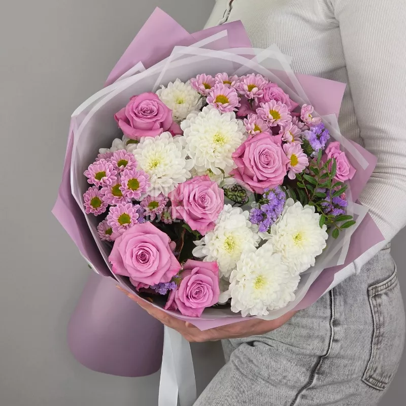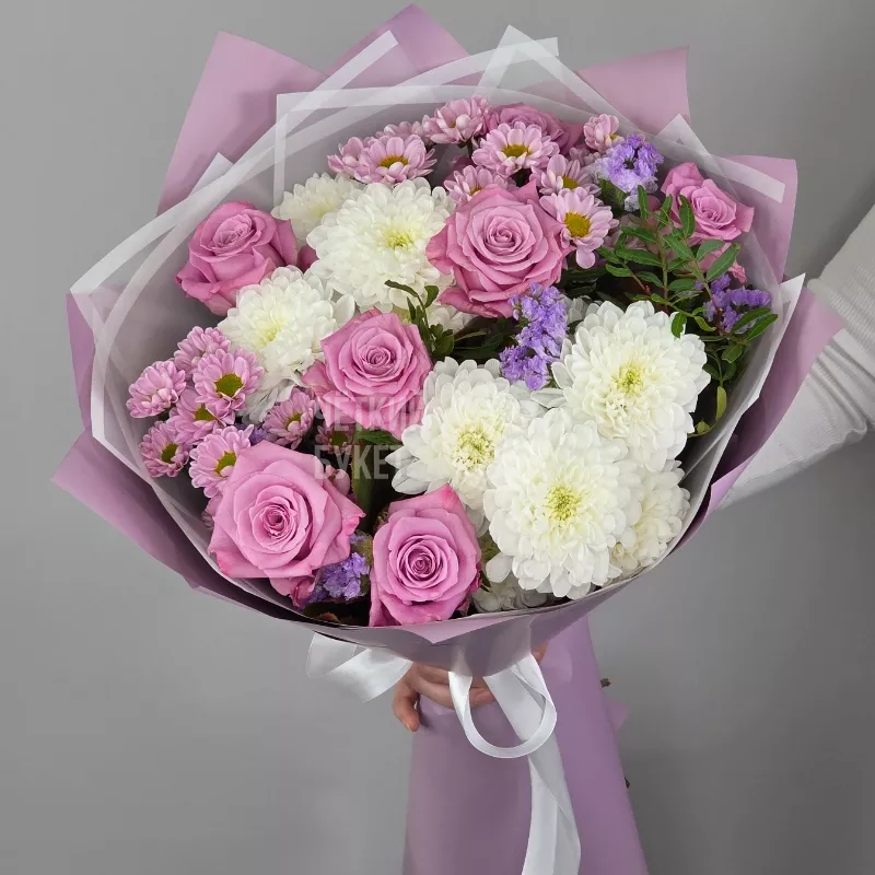 Этот элегантный букет сочетает в себе яркое многообразие цветов: розы, фисташия, статица и хризантемы, создавая гармоничный и насыщенный композиционный образ. Он наполнен свежестью и ароматом , идеально подойдет для любого торжества или приятного сюрприза. Статица добавляет объем и изящность, подчеркивая утонченность каждого цветка в этой великолепной цветочной гармонии.