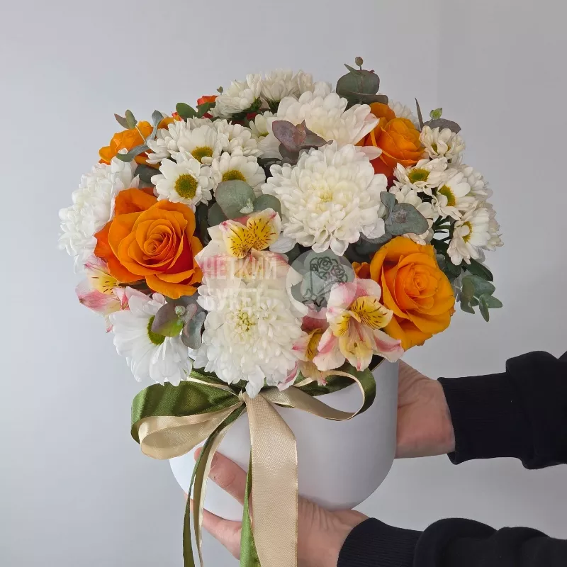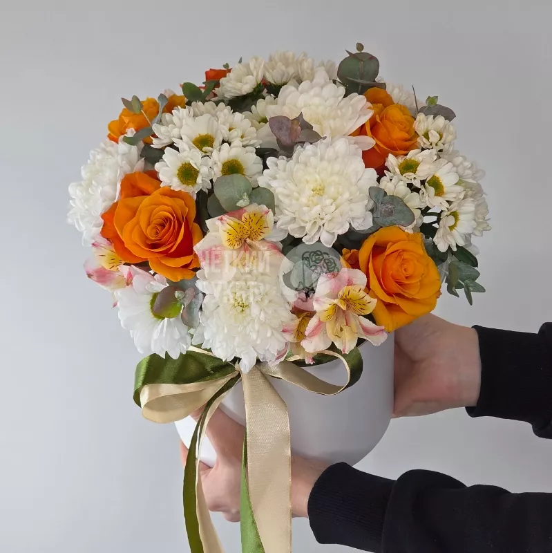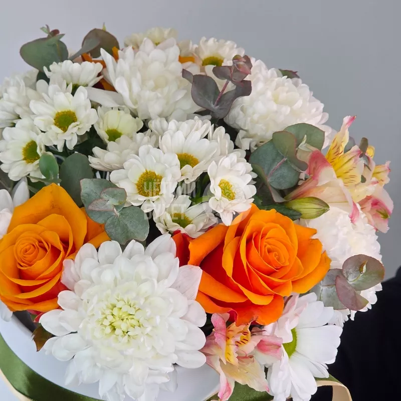 Розы махровые хризантемы сантини и альстромерии с эвкалиптом в шляпной коробке