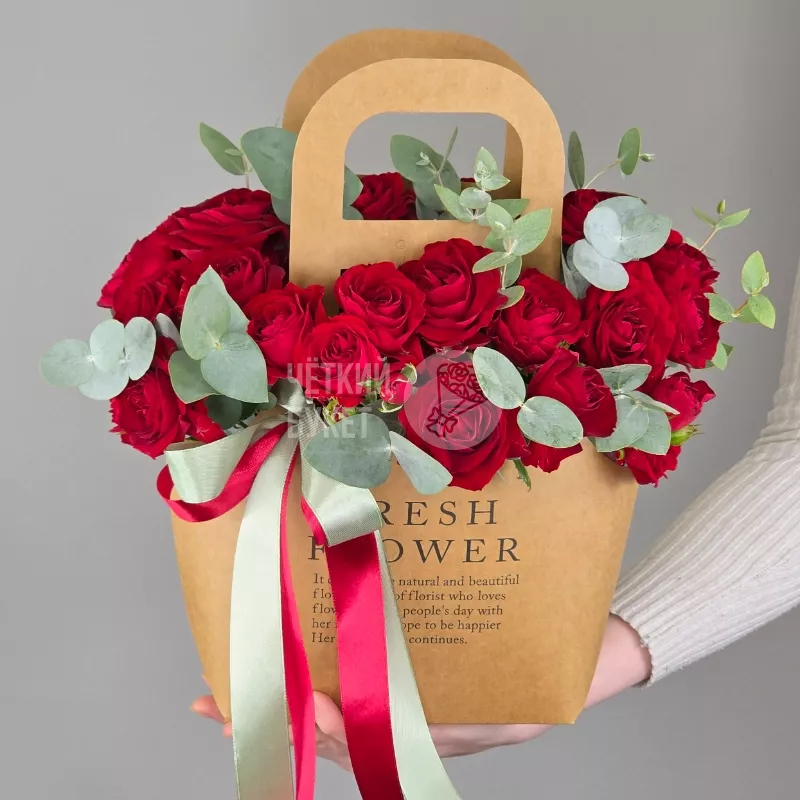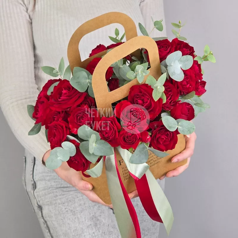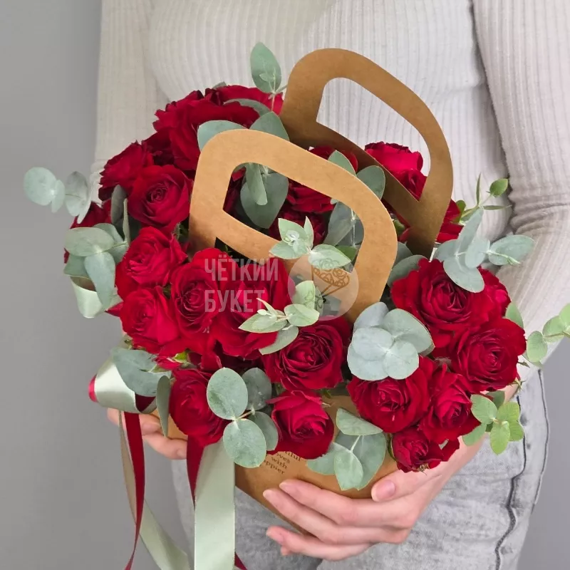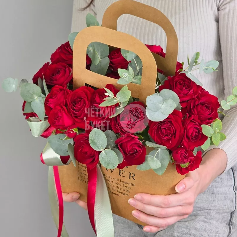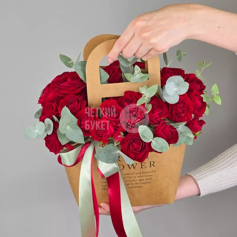 Моно композиция из красных кустовых роз сорта Ред Дайменшен в картонной сумочке на флористическом оазисе с добавлением зелени фисташки ,оформлена атласными лентами.