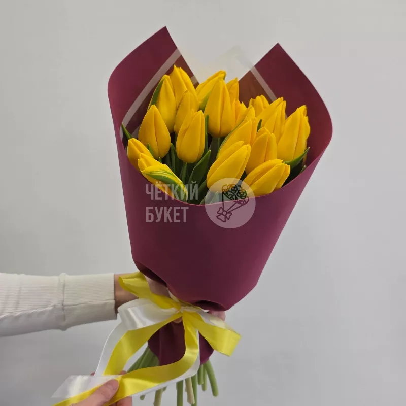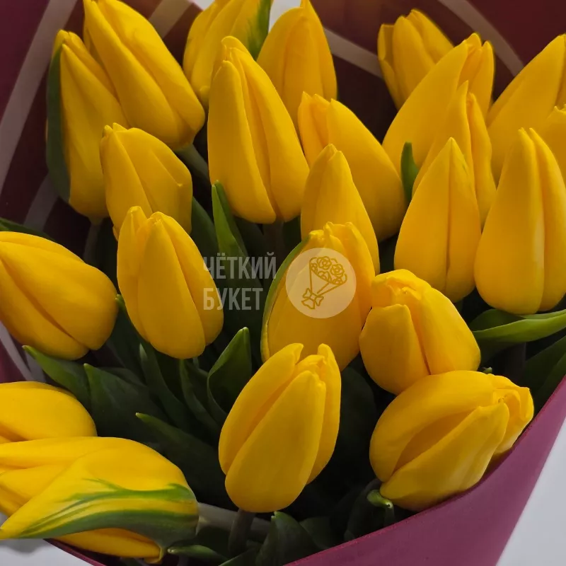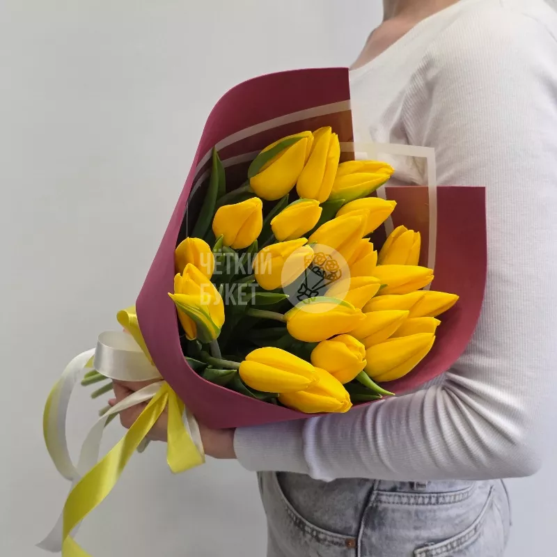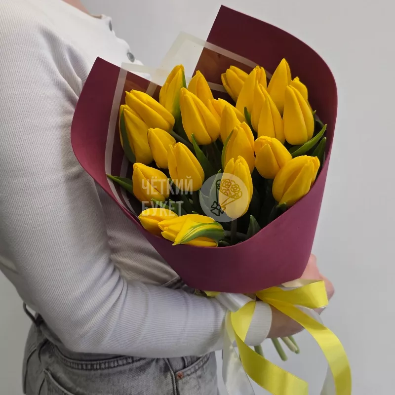 Букет из 25 желтых тюльпанов в бордовом