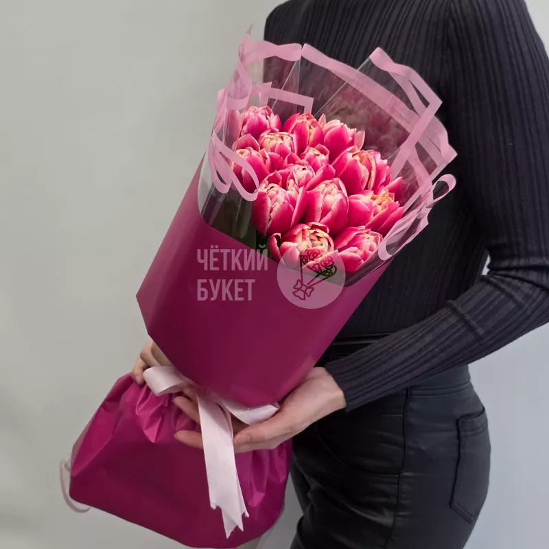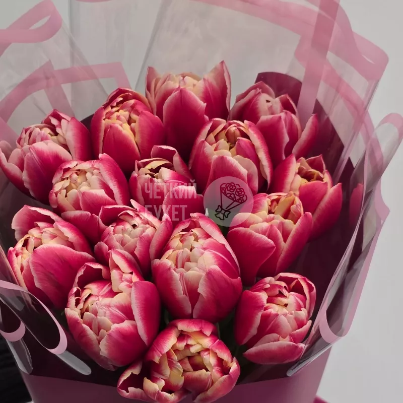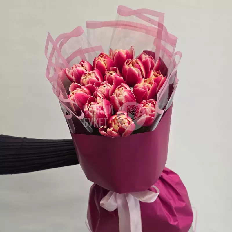 Букет из 15 пионовидных тюльпанов в стильном оформлении