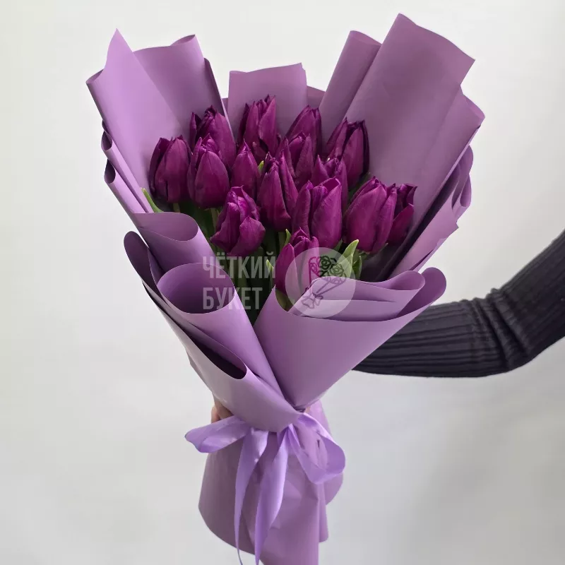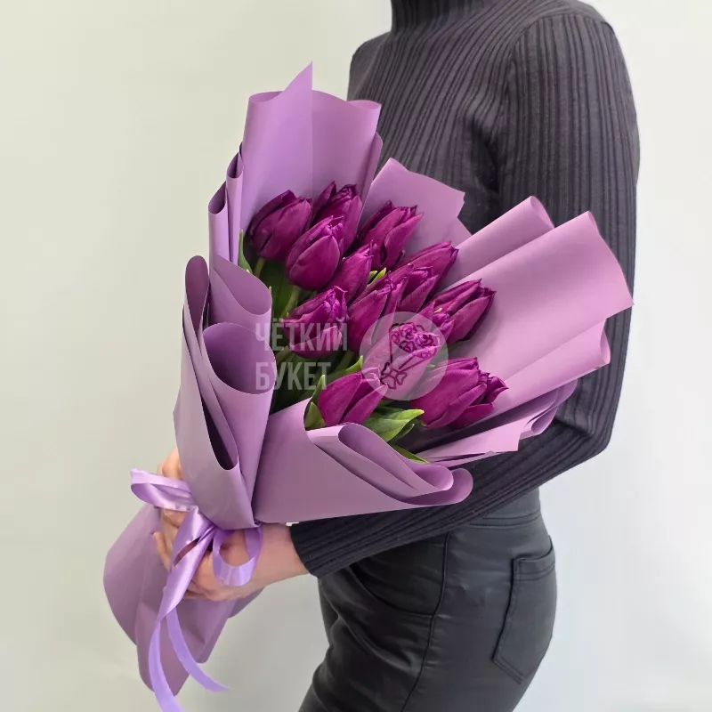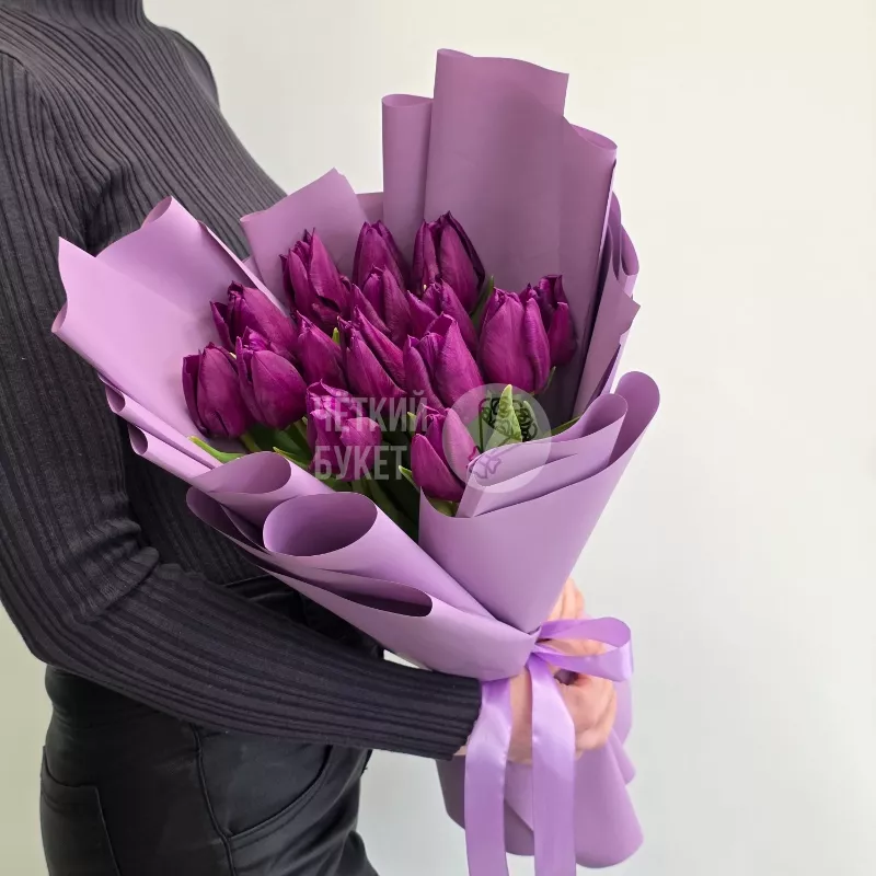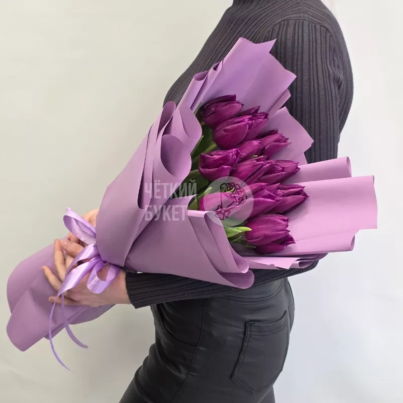 Букет из 15 фиолетовых тюльпанов в стильном оформлении