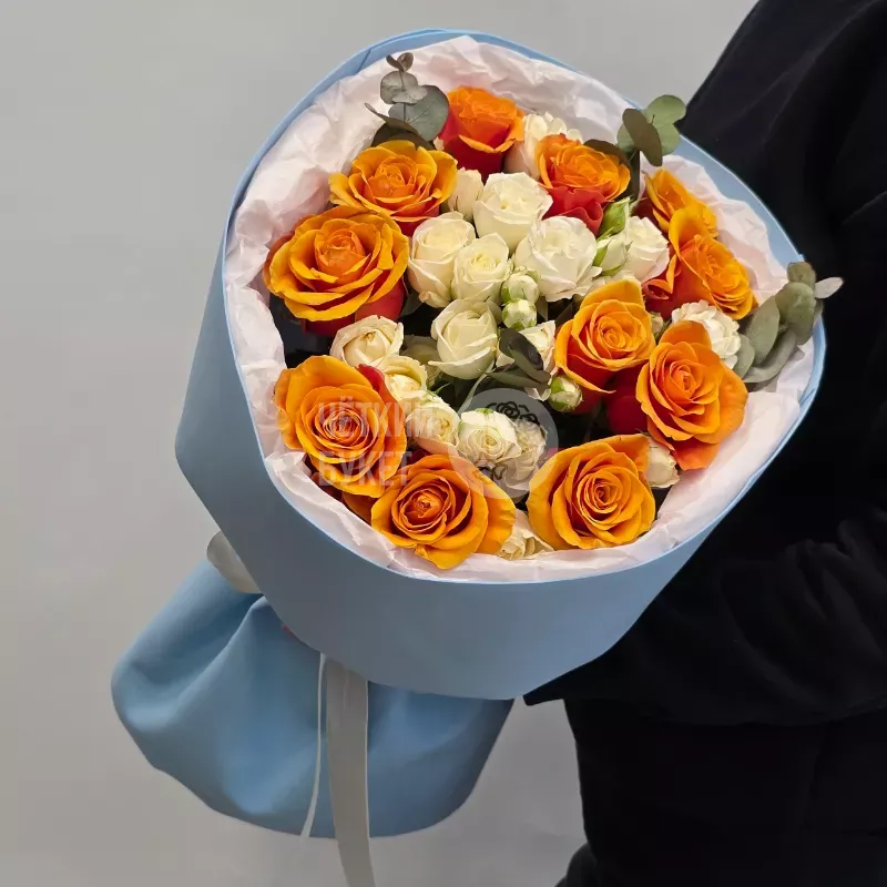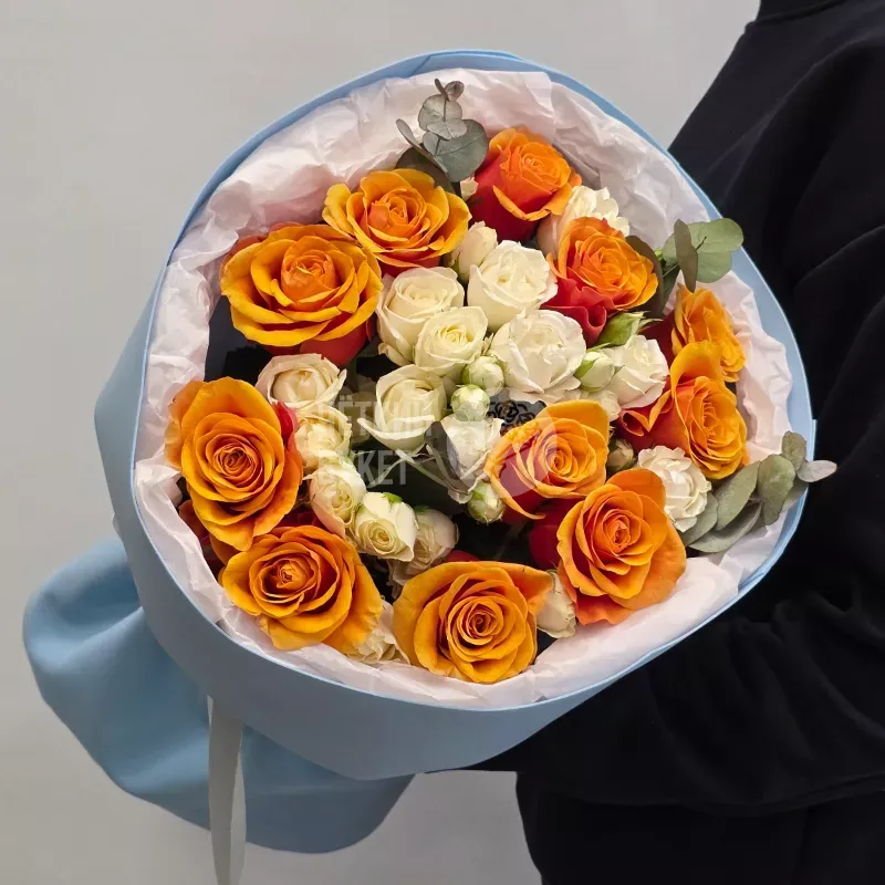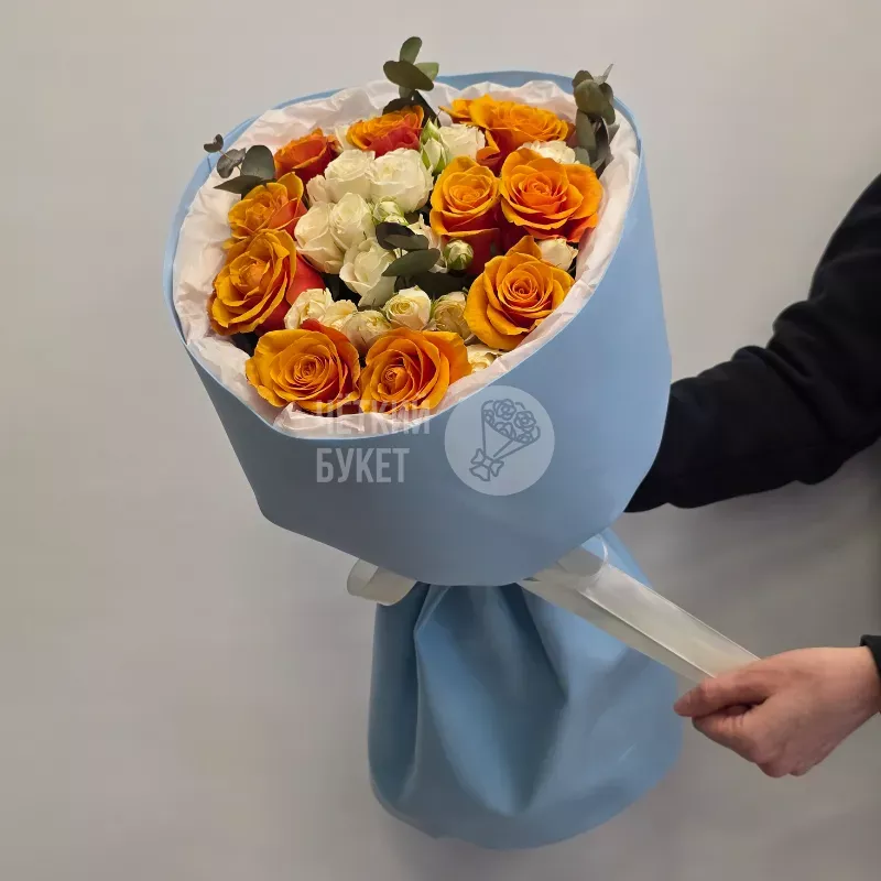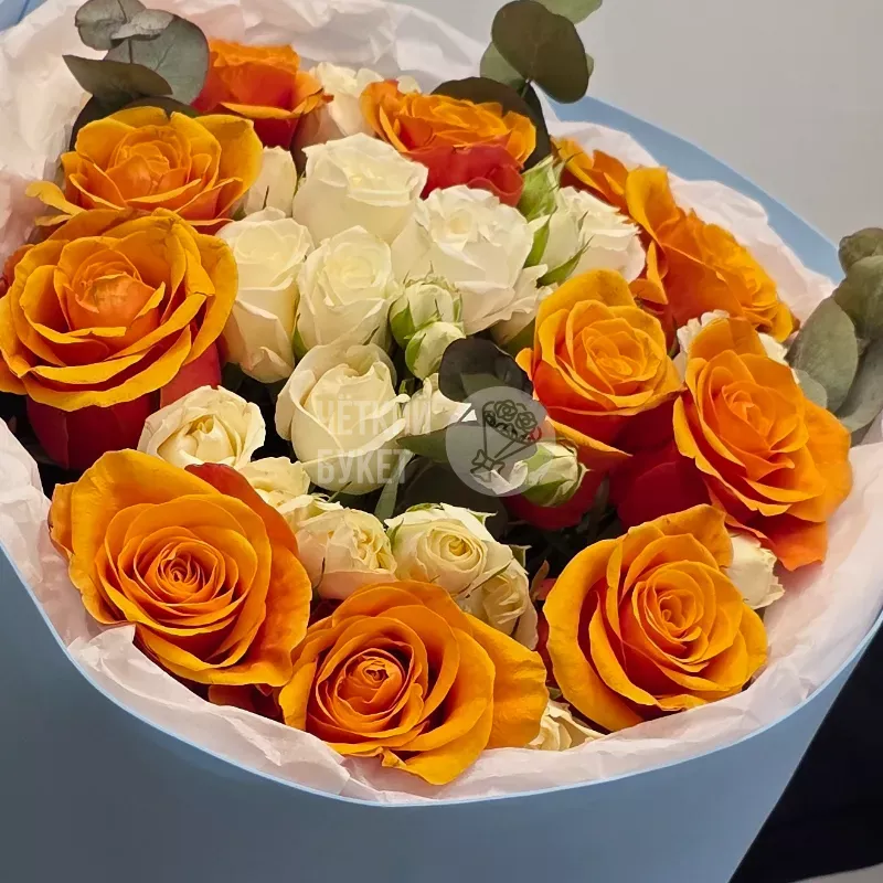 Букет из ярких оранжевых и белых кустовых роз с эвкалиптом в голубом