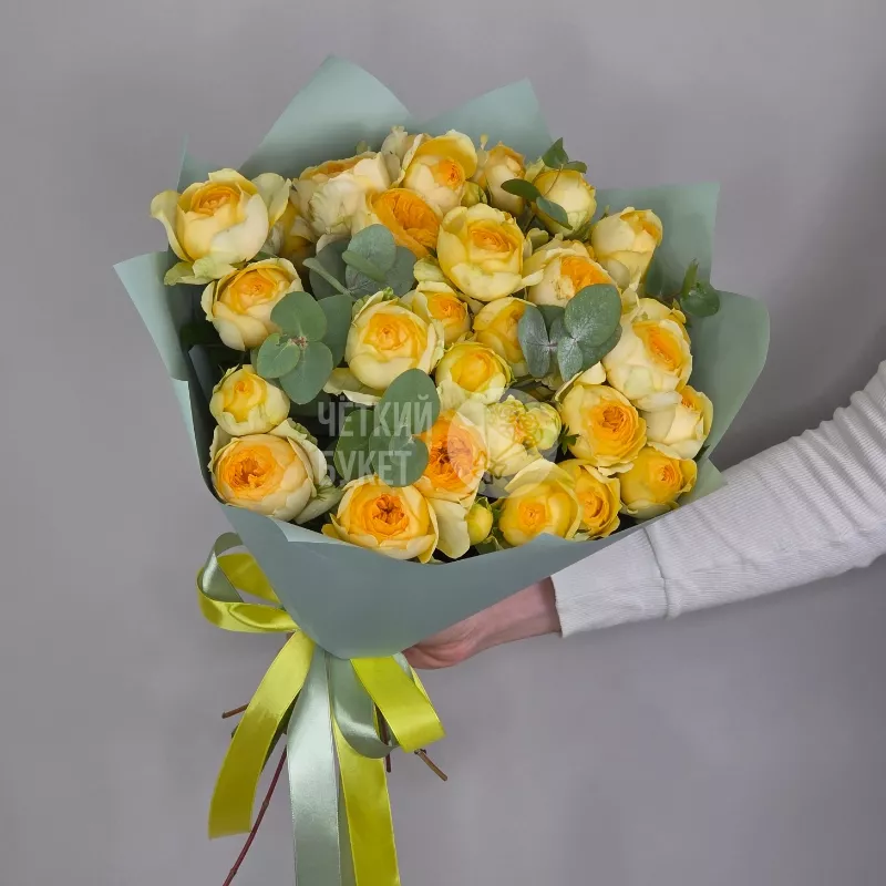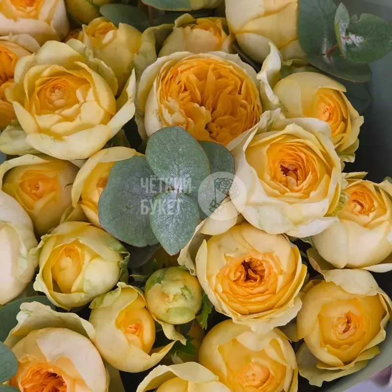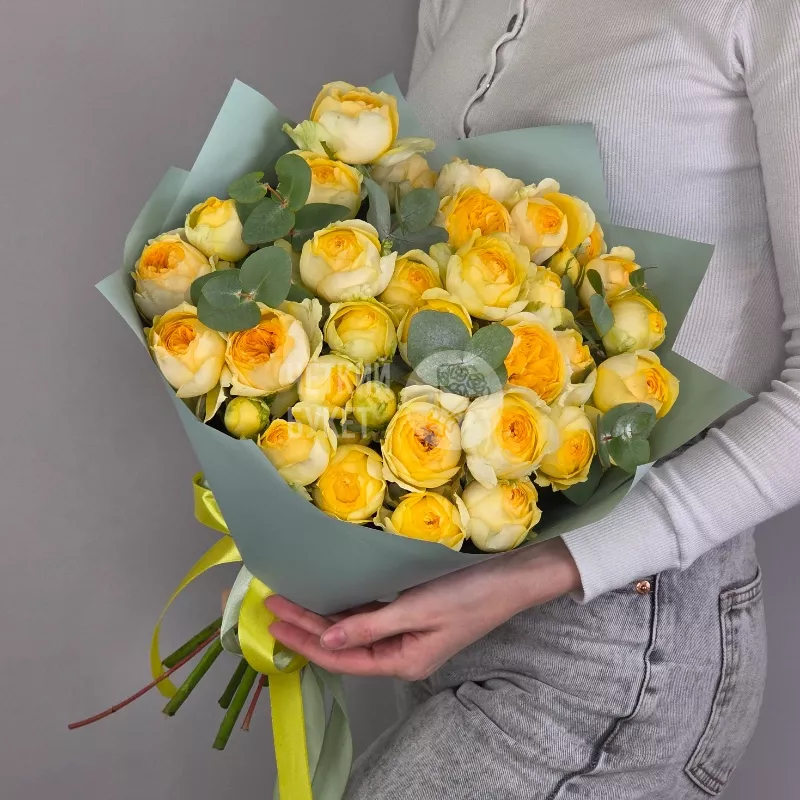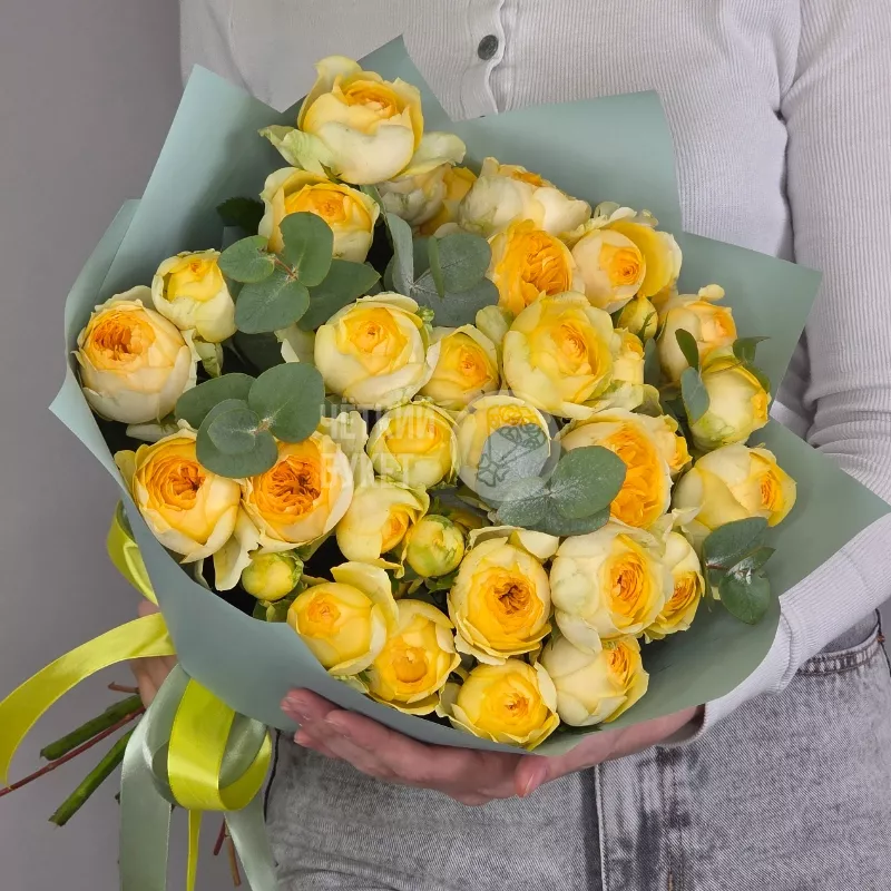 Букет из 9 желтых пионовидных роз Сильва Санни с эвкалиптом