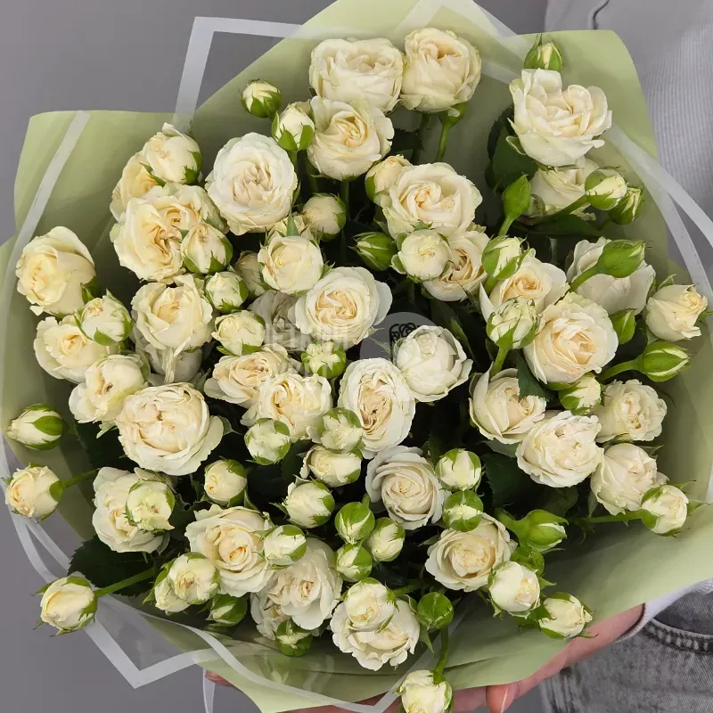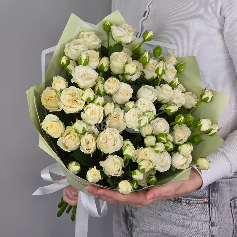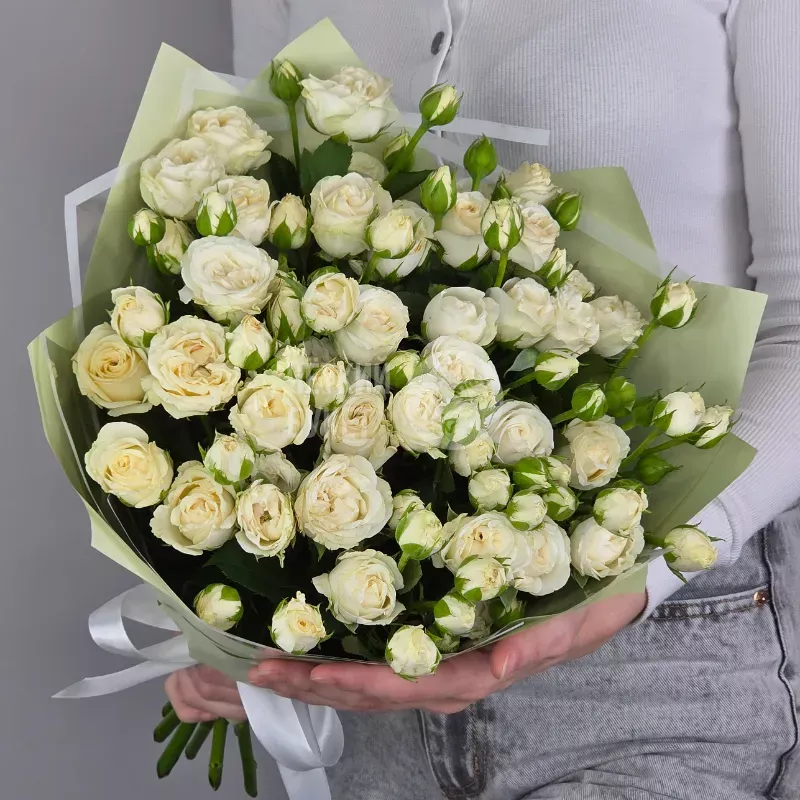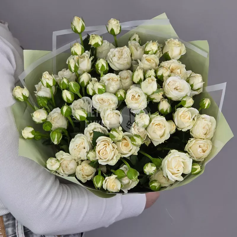 Букет из 15 белых кустовых роз Беларусь в зеленом